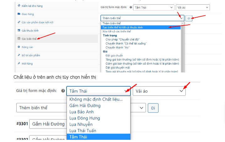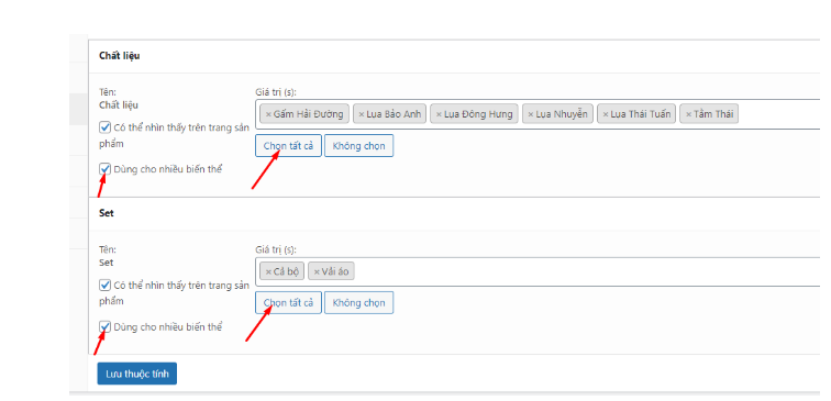 B3. Kích vào các thuộc tính/ Chọn các biến thể muốn cho hiển thị/ nhấn nút thêm