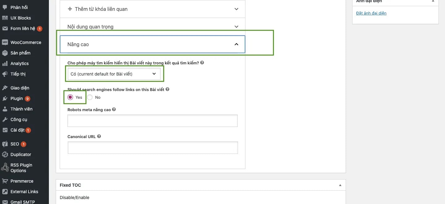Bước 2: Chuyển đến phần “Thiết lập nâng cao” trong giao diện của Yoast SEO. Tại đây, bạn có thể tùy chỉnh thuộc tính của thẻ Meta Robots bằng cách chọn giá trị “noindex” và “nofollow”. Ngoài ra, trong tab “robots meta nâng cao,” bạn cũng có thể thực hiện cấu hình cho các thẻ meta khác.